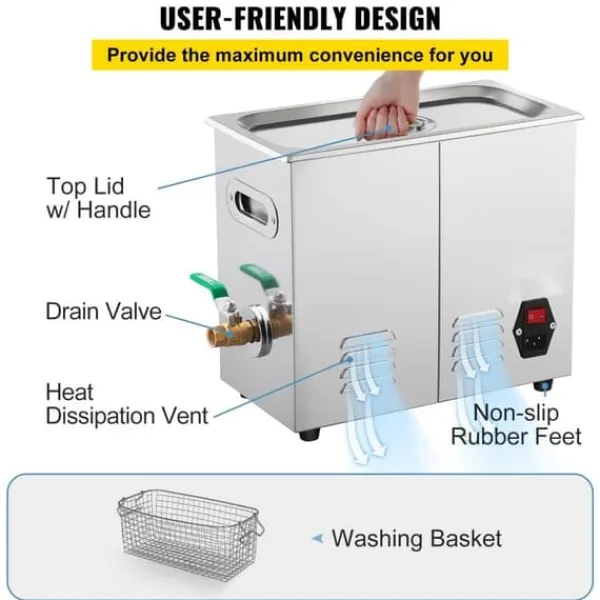 Säker i användning: Med ventiler för värmeavledning, halkfria gummifötter och ett avloppsventil för vattenavrinning är ultraljudsrenaren extremt säker att använda.