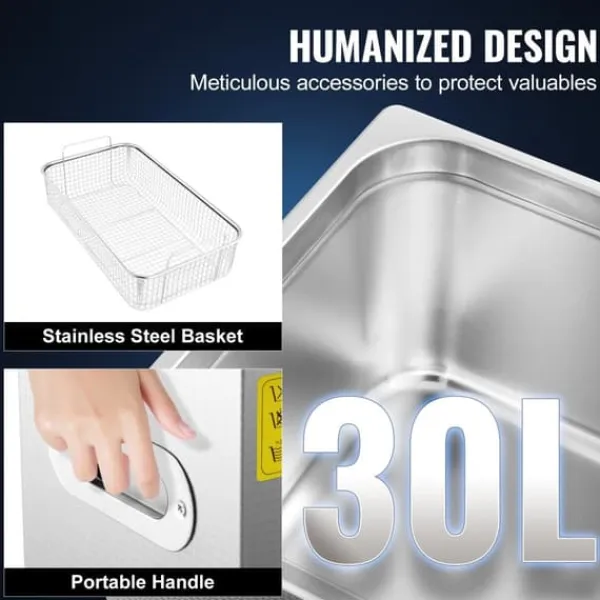 Ultraljudssmyckesrengöraren har en stor tank på 30 L / 8 Gallon och en rengöringskorg som minskar friktionen vid tvätt.