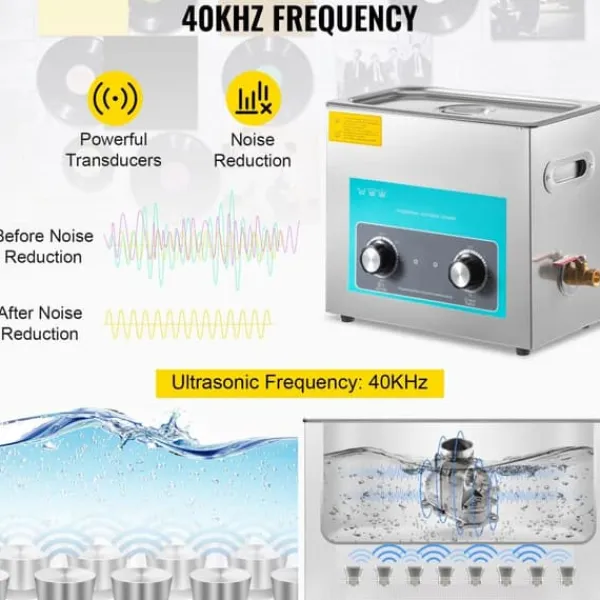 Förstärkt 40 kHz ultraljudskraft, utmärkt för att ta bort olja, vax, fläckar i hål, ytor, springor osv. 6,5 l stor tank för att rymma fler varor samtidigt, och den är tyst under användning. Stör aldrig dina andra arbeten.
