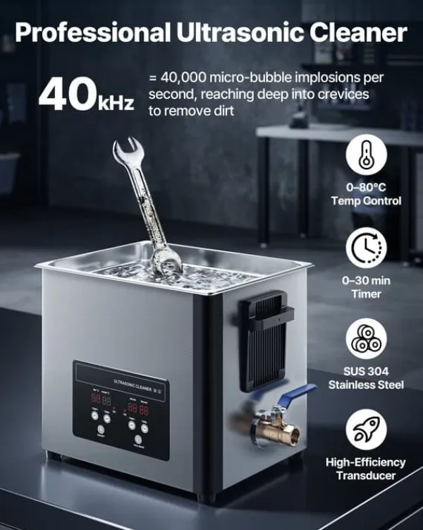 Ultraljudsvågor på 40 kHz skapar täta mikrobubblor som imploderar och “borstar” bort fett och partiklar även inne i kanaler och munstycken. Resultatet blir jämn djuprengöring av förgasare, airbrushar, klocklänkar och små mekaniska delar.