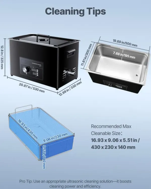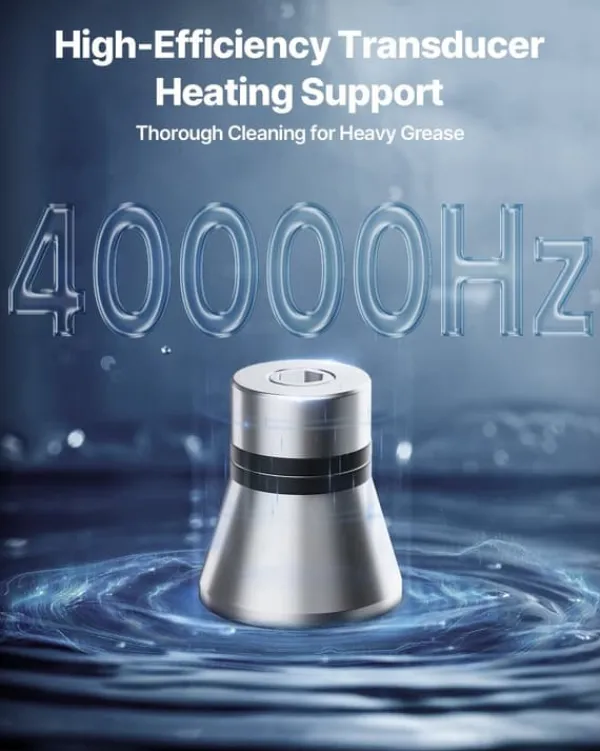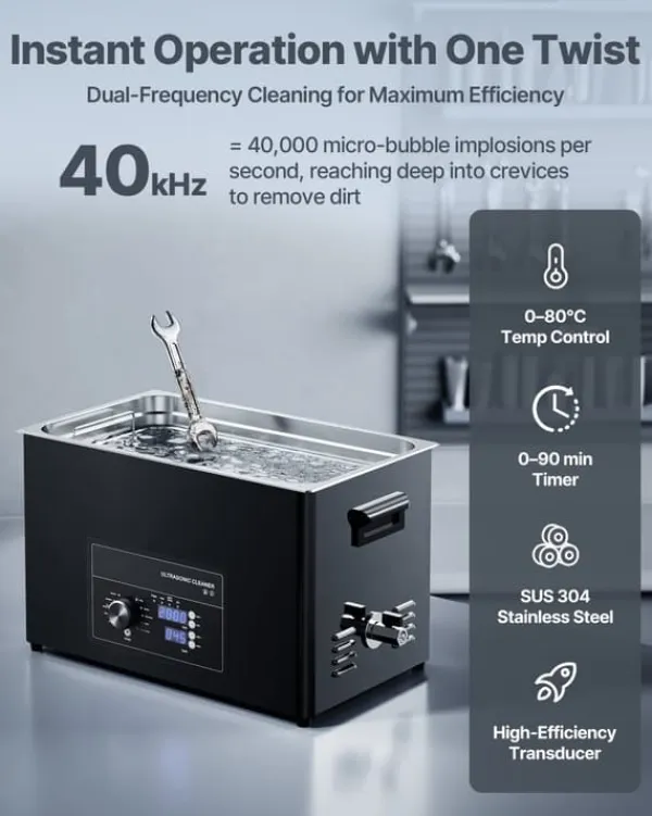 Effektiv 40 kHz rengöring som når in i minsta skrymsle Ultraljudsvågor på 40 kHz skapar mikrobubblor som imploderar och lyfter bort föroreningar även från finmekanik och invändiga kanaler. Använd tillsammans med neutralt rengöringsmedel och varmt vatten för maximala resultat.