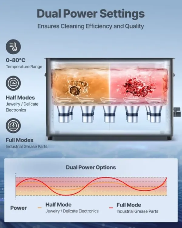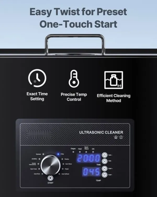 Kraftfull ultraljudsrengörare för snabb, skonsam och djupgående rengöring Denna robusta ultraljudsrengörare lyfter effektivt bort oljor, smuts och partiklar från svåråtkomliga ytor med 40 kHz ultraljud. Perfekt för allt från smycken och klockor till förgasare, sprutmunstycken och industridelar. Justerbar tid, temperatur och effekt ger precisa resultat varje gång.
