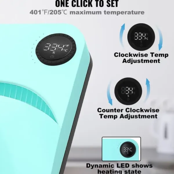 Vrid ratten åt höger för att ställa in temperaturen och vrid den åt vänster för att ställa in tiden. Jämfört med gammaldags värmepressar kommer vår bärbara värmepress med 9 LED-indikatorer och en stor digital display, som ger en snabb sammanfattning av temperatur och tidstillstånd. Njut av varje operation och process med tillförsikt. Det här är din tid att koppla av!