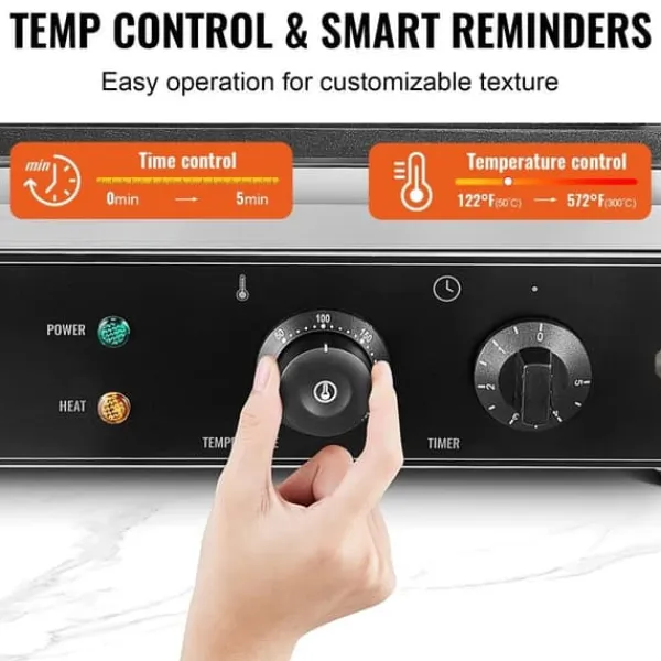 Vårt korvvåffeljärn har en temperaturkontrollratt (122-572°F / 50-300°C) så att du kan anpassa tillagningen efter dina egna preferenser. Med individuell förberedelse och hörbara varningar blir det enkelt att skapa perfekta våfflor varje gång.