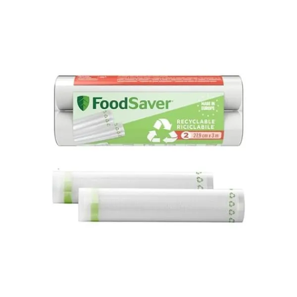 Pack med 2 vakuumförpackningar FoodSaver (28cm x 3m) som är återvinningsbara. Perfekta för att förlänga hållbarheten på dina livsmedel, de passar alla typer av livsmedel. Deras återvinningsbara material och hermetiska försegling bevarar färskhet och smak. Spara tid och pengar samtidigt som du tar hänsyn till miljön.