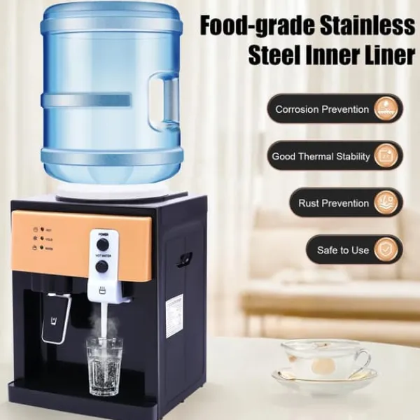 Kompakt bänkdispenser för varmt/kallt/ljummet vattenEn smidig, fristående vattenautomat som levererar varmt, ljummet och kallt vatten med en knapptryckning. Perfekt för kök, kontor och camping. Stilren finish i champagneguld/silver som passar i alla miljöer.