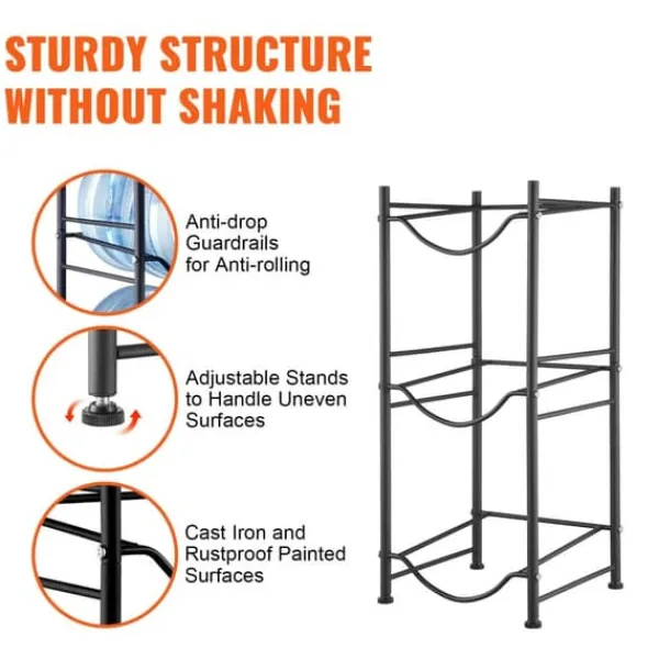 Vattengallonhållaren har höga skyddsräcken för att förhindra att högre skopor faller, hyllspår för att hålla skoparna säkra och justerbara fötter för att skydda golv och stabilisera ställningen på ojämna ytor. Handtag gör det enkelt att placera skopan.