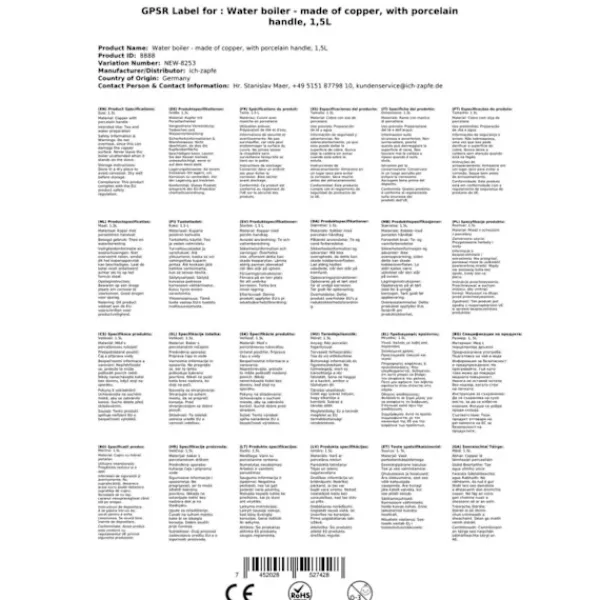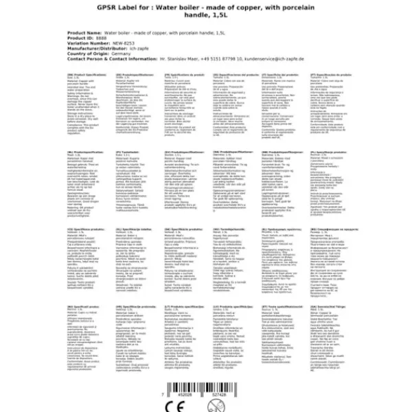 Vattenkokare i koppar, tekokare – av koppar, med handtag av porslin, 1,5 liter Upptäck den klassiska koppar-te-kokaren med en tennpläterad insida och ett elegant porslinshandtag. Detta redskap är inte bara funktionellt, det är också ett attraktivt föremål för att komplettera din köksutrustning. Vattenkokaren är gjord av koppar, vilket är känt för att vara en stor energisparare då den värms upp väldigt snabbt och inte kräver en stark låga. Detta gör den perfekt för att koka vatten och göra te. Te-kokaren i koppar är inte bara ett bruksföremål, utan också ett dekorativt tillbehör. Dess enkla design gör den till en tidlös pjäs som passar vackert in i alla kök, oavsett om det är en rustik eller modern miljö. Egenskaper •Klassisk tekokare av koppar •Pläterad insida •Elegant porslinshandtag •Koppar värms upp snabbt och sparar energi •Perfekt för att koka vatten och göra te •Attraktiv och tidlös design •Anpassar sig till alla köksmiljöer •Kapacitet på 1,5 liter •Mått: 200×200×150 mm •Vikt: 700 g Observera att tekokaren är målad på utsidan. Innan du använder den måste färgen tas bort. För att göra detta rekommenderar vi att du blötlägger redskapet i en stor behållare med vatten och bikarbonat och sedan kokar det i 15 minuter. Du kommer att observera hur lackskiktet separerar från produkten. Efteråt kan du tvätta redskapet med tvål och vatten och torka det med en ren trasa. Om du vill kan du använda en speciell produkt för rengöring av metaller för att bevara den yttre glansen. Se till att du tar bort all färg innan du använder redskapet eftersom det kan mörkna av ugnsvärmen. Komposition: koppar, tenn och mässing.