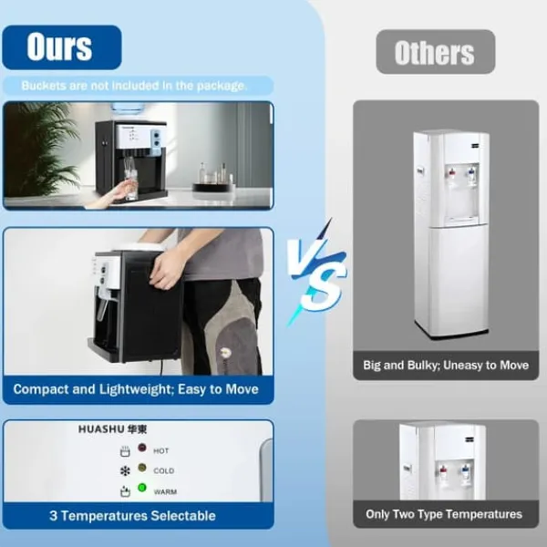Gör det enkelt att dricka mer vatten varje dag. HS-09 i elegant svart ger varmt tevatten på sekunder och uppfriskande kallt vatten när du vill, utan att ta mycket plats på skrivbordet eller golvet.