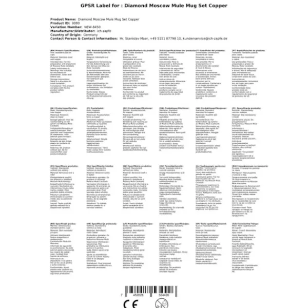 Diamondmoscow mule glas mugg set koppar I en dekorativ presentförpackning! Detta set tillverkat av högkvalitativt rostfritt stål innehåller: •4x Moscow Mule-koppar släta (450 ml)•1x Mini Moscow Mule Jigger amp; Shot (med invändig skalning)•4x kopparfärgade sugrör•1x rengöringsborste för sugrör Rengör innan användningUppmärksamhet! Ej lämplig att använda i diskmaskin