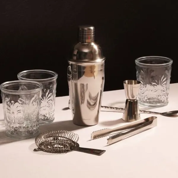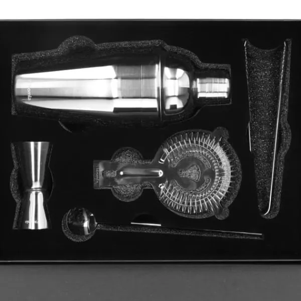 MOI Setet är ett set bestående av fem element som, när de kombineras, hjälper dig att skapa de bästa drinkarna hemma. Setet innehåller allt du behöver för att din drink ska se bäst ut: en isskakare, en barsil, en barsked med en skiva, ett barmått och en istång. Måtten på paketet med alla delar av setet inuti är 24x32cm .
