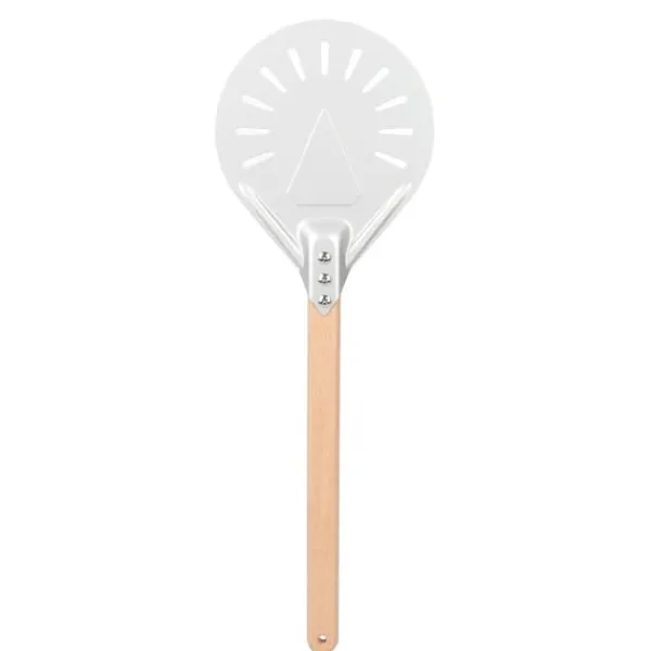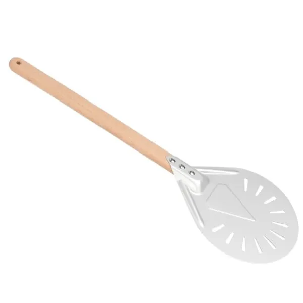 Denna pizzaspatel är inte bara bekväm utan också mångsidig. Det gör att du enkelt kan överföra din pizza från arbetsstationen till pizzaugnen, vilket gör bakningen till en lek. Perforeringarna på den vändande spateln hjälper också till att frigöra överflödigt mjöl från botten av degen, vilket minskar risken för brända skorpor.