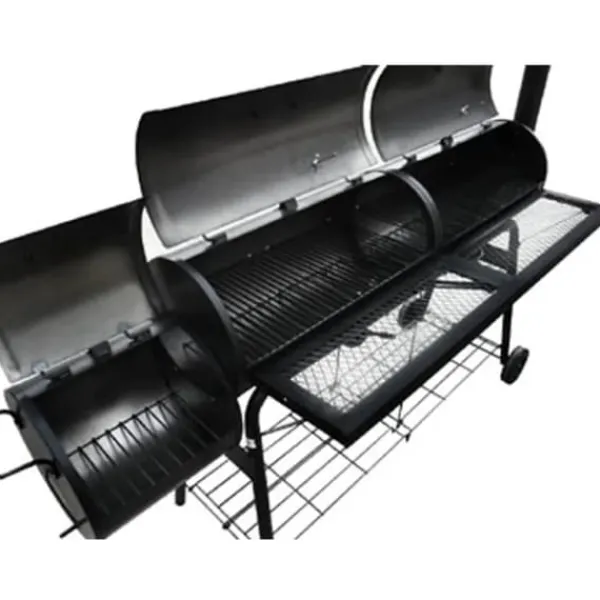 Denna rökgrill är en kombination av en traditionell grill och en rökgrill. Du kan använda den till att grilla, röka, rosta och hålla maten varm. I eldfacket producerar träet värme och rök som sprids jämnt inuti rökgrillen. Om du håller dig till ett sätt att laga mat kan den separata eldlådan användas för att hålla värmen på din redan grillade mat.