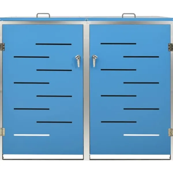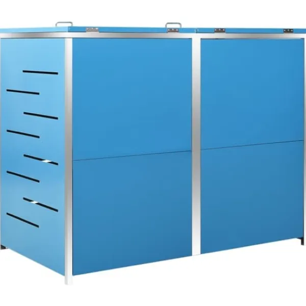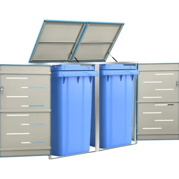 Sopskjulet är tillverkat av galvaniserade stålpaneler och en ram av rostfritt stål, vilket gör det mycket robust och rostbeständigt. Den ihåliga designen släpper in luft och förhindrar otrevliga lukter, medan låset säkerställer säker förvaring av soporna. Dessutom gör det praktiska locket och fjädrarna det enkelt att ta ut och sätta in sopkärlet.