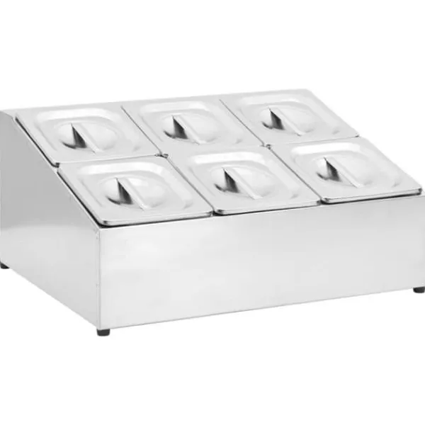 Denna gastronormbehållare i rostfritt stål är perfekt för att förvara och servera dina rätter. Med 6 GN 1/6-kärl och inkluderade lock är den idealisk för restauranger och hushåll. Lätt att rengöra och diskmaskinssäker, garanterar den optimal stabilitet tack vare sina halkfria fötter.