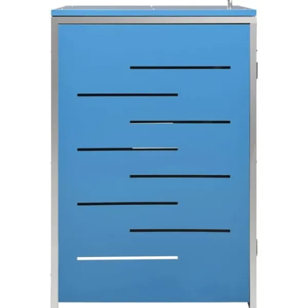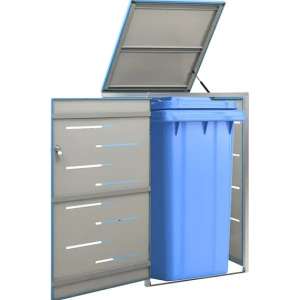 Sopskjulet är tillverkat av galvaniserade stålpaneler och en ram av rostfritt stål, vilket gör det mycket robust och rostbeständigt. Den ihåliga designen släpper in luft och förhindrar otrevliga lukter, medan låset säkerställer säker förvaring av soporna. Dessutom gör det praktiska locket och fjädrarna det enkelt att ta ut och sätta in sopkärlet.