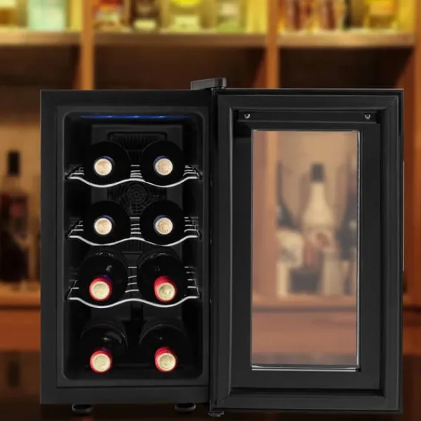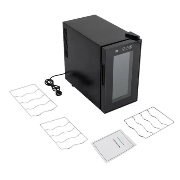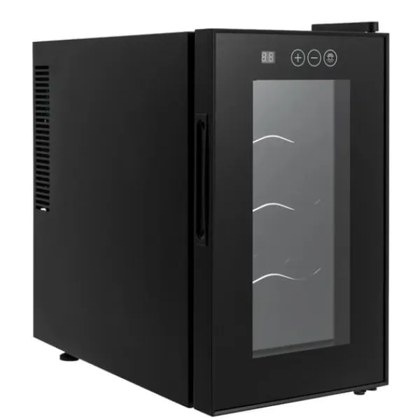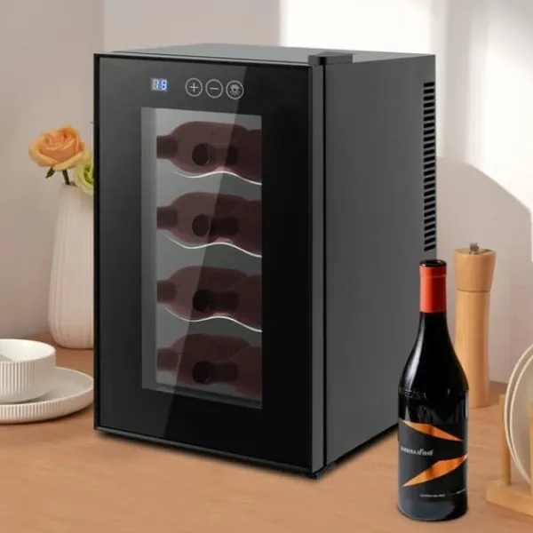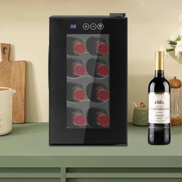 Kompakt vinkyl 23 L för 8 flaskorDenna fristående svarta vinkyl med LED‑display ger noggrann temperaturkontroll mellan 8–18°C och rymmer upp till 8 flaskor. Halvledarkylning, låg ljudnivå och flyttbara hyllor gör den perfekt för hem, kontor, hotell, barer och klubbar – idealisk för rött, vitt och dessertviner.