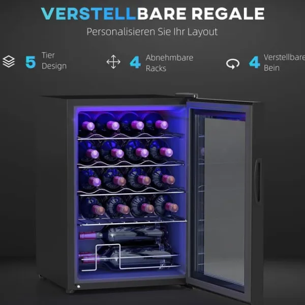 Detta Rootz Glass Door Wine -kylskåp har 20 flaskor på fem kromställ med justerbar konfiguration. Tyst och effektiv kylning, exakt temperaturkontroll (5-18 ° C) och UV-resistent glasdörr. Perfekt för kök, hemmakontor eller hembar.