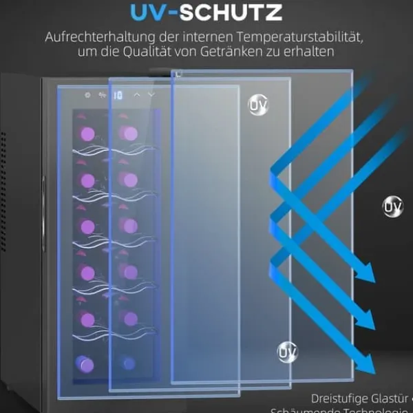 – Förbättrad isolering: Vin kylskåpets trelagers glasdörr med skumteknik och UV-beständighet ger optimal isolering och skydd och bevarar dryckernas kvalitet. Kompletteras med ett mysigt blått takfönster och en dörr med glasfönster för synlig skönhet.