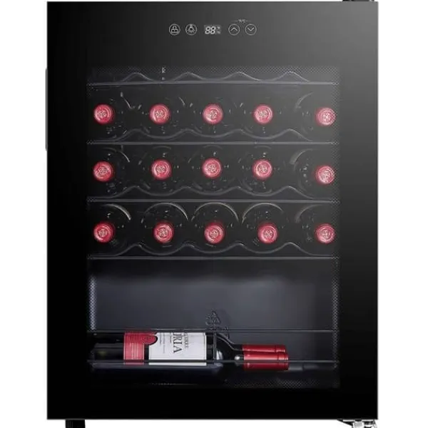 Självbärande vinkyl för 24 flaskor, svart färg. Utrustad med 5 hyllor av tråd och en korg, erbjuder den elektronisk kontroll och LED-belysning. Dimensioner: 85,5 x 54,5 x 56,5 cm. Energiklass G, tyst vid 40 dB, idealisk för att bevara dina viner.