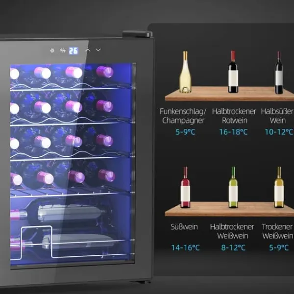 Denna kompakta vinkyl erbjuder effektiv och tyst kylning med exakt temperaturkontroll, vilket gör den idealisk för kök, hemmakontor eller barer. Dess UV-beständiga dubbelglasdörr och justerbara hyllor rymmer olika flaskstorlekar samtidigt som den visar upp din samling med ett elegant blått inre ljus.