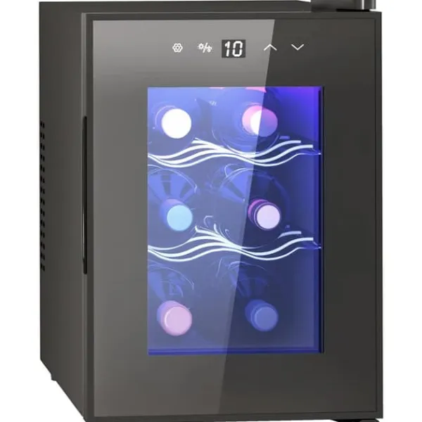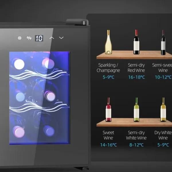 Njut av vin i perfekt skick med ett kompakt vinskåp för 6 flaskor. Det dubbla termoelektriska kylsystemet kyler snabbt, tyst och energieffektivt (klass E), medan den eleganta svarta designen passar kök, lägenheter och hemmabaren.