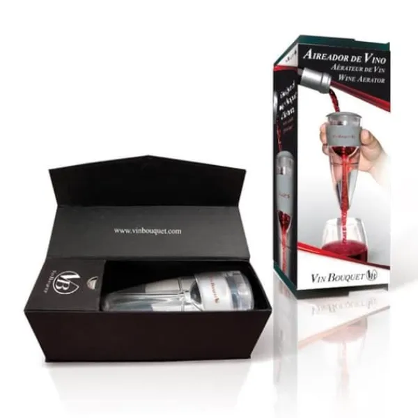 Upptäck VinBouquet vinluftaren, som dekantar ditt vin direkt utan karaff. Förbättra aromerna och smakerna redan vid servering. Praktisk och elegant, levereras den med en broderad sammetspåse, perfekt för vinälskare.