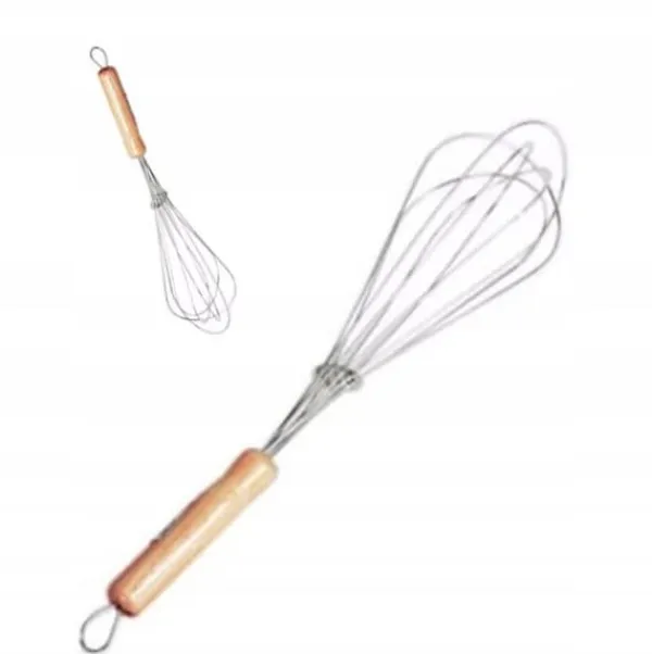Handtaget är av trä medan resten av vispen är av rostfritt stål.
