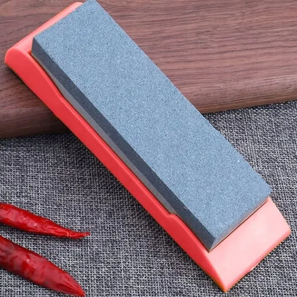 KNIVSLIPPARE Dubbelsidig slipare utformad för grov slipning och sedan utjämning av bladet. Perfekt för att slipa knivar, saxar, liear. Brynet har två lager slipsten med olika nyanser. Den mörkare sidan med lägre korn används för förslipning. En ljusare sida med högre korn för att avsluta bladet och bli av med större klumpar och sneda kanter. OBS: Stenen måste användas våt. Setet innehåller en halkfri brynehållare som gör att du kan slipa din kniv utan att brynet glider över bänkskivan.