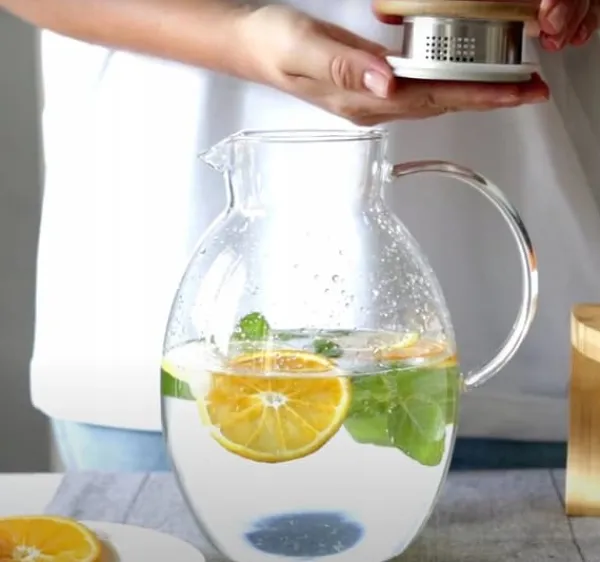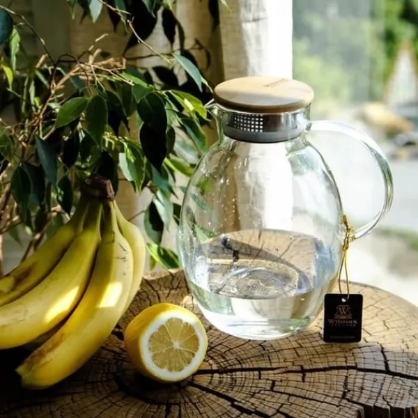 Denna glaskanna är tillverkad av speciellt värmebeständigt glas som tål höga temperaturer. Du kan använda denna kanna för att tillaga kompott direkt på spisen. Kannan behåller också sin svalka väl, vilket gör den lämplig för att servera kall lemonad. Kannans topp är prydd med ett unikt naturligt bambulock, vilket framhäver dess moderna design.