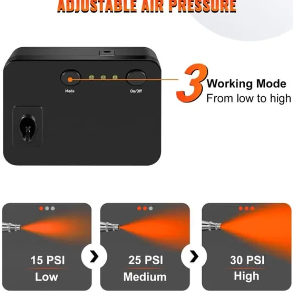 0-30PSI 3 justerbara trycklägen. Högtrycksläget är utformat för snabb sprutning, medan lågtrycksläget är för mer detaljerad sprutning.