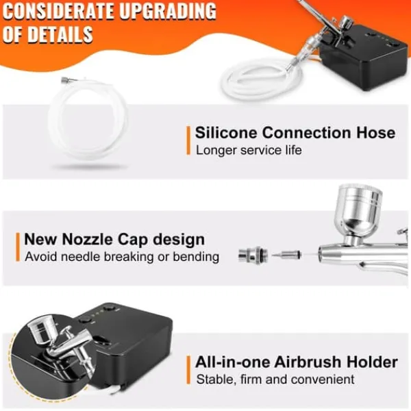 -Uppgraderad vätskespetsdesign: Det nya vätskemunstycket minskar effektivt risken för nålböjning och brott, vilket ger överlägsen finfördelning och exakt spraykontroll. De medföljande 0,2, 0,3 och 0,5 mm vätskespetsinställningarna gör att denna airbrush levererar de ultrafina detaljerna i airbrushade målningar. Det finns också en pennhållare fäst vid kompressorn så att du kan placera din airbrush när den inte används.