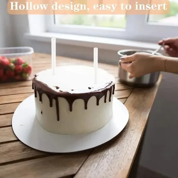 Varje stöd är rörformat, vilket gör att det enkelt kan justeras till alla typer av tårtor. För att justera det till rätt höjd, använd helt enkelt en tandad kniv – exakt skärning av stödet är möjligt till valfri längd, tack vare vilket varje lager av tårtan kommer att stödjas perfekt. Stöden har en