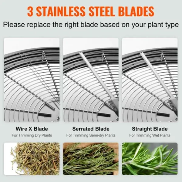 – Utbytbara blad: Vår manuella knopptrimmer har 3 blad i rostfritt stål för att möta behoven hos olika växttyper. Raka blad är designade för beskärning av våta växter, tandade blad för beskärning av torra växter och tråd ”X”-blad för halvtorra växter. De rostsäkra bladen är lätta att rengöra, men var försiktig.