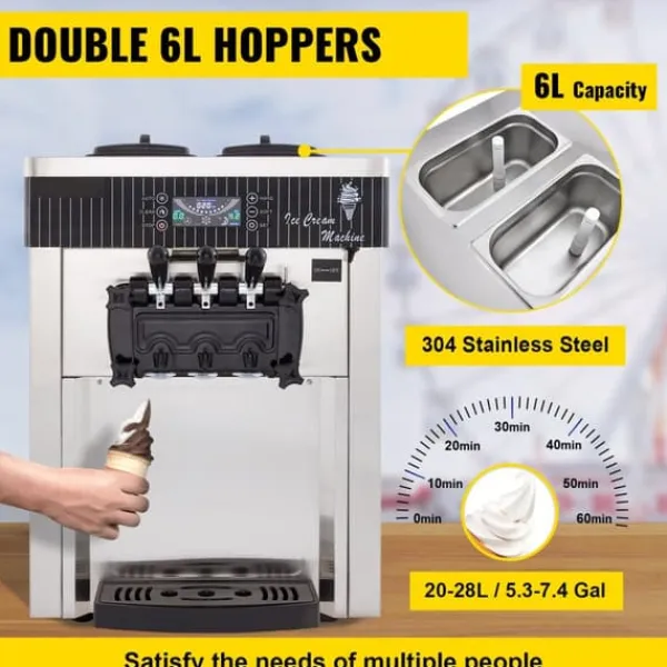 Toppen är utrustad med två 1,6 Gal (6 L) 304 rostfria behållare som kan producera 5,3-7,4 Gal (20-28L) per timme. Du kan med andra ord effektivt göra cirka 10 glassar åt gången. Högre avkastning och högre vinst.