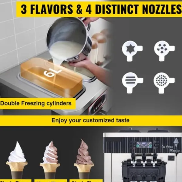 Tillhandahåll 3 olika smaker (2 enkla smaker och 1 blandad smak) för att berika dina val och möta kundernas olika behov. Dessutom ingår 4 olika munstycken, använd dem för att få din glass att se annorlunda ut än andra, vilket gör glasstillverkningen mycket roligare.