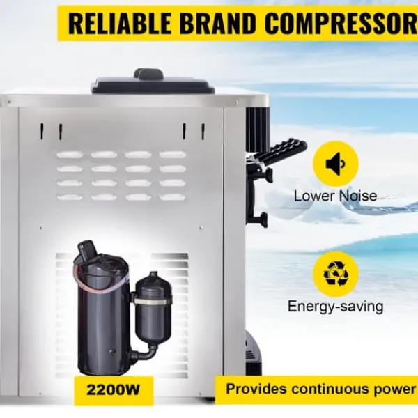 Denna mjukglassmaskin är beroende av ett kraftfullt kylsystem och kylare, som kan arbeta effektivt och stabilt. Den högkvalitativa 2200-watts kompressorn ger kontinuerlig kraft till maskinen, minskar buller, sparar energi och är humaniserad.