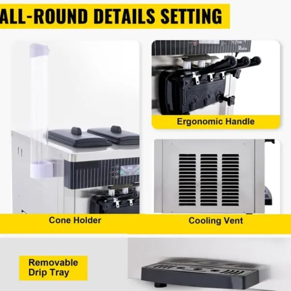 -2200W Kraftfull kompressor: Drivs av en 2200W högkvalitativ kompressor, denna kommersiella glassmaskin har snabbare kylning, mindre buller och lägre strömförbrukning. Köldmediet R410a gör glassproduktionen mer energieffektiv, vilket gör att du kan göra mjukglass utan att behöva oroa dig för att elräkningen ska skjuta i höjden.