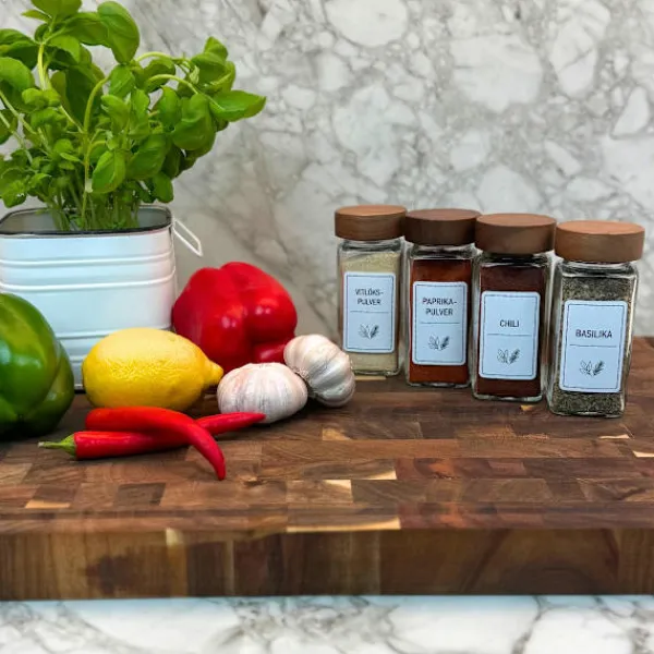 De mörka locken i akaciastil ger ett exklusivt intryck och gör att burkarna blir en fin del av inredningen. Tillsammans med det klara glaset blir kryddorna en naturlig färgklick i köket, samtidigt som allt hålls prydligt organiserat.
