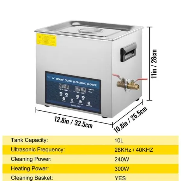 – Högkvalitativt material: Tankstorlek: 10L; Ingång: 220V; Givarkvantitet: 4 set; Ultraljudseffekt: 240W; Ultraljudsfrekvens: 28/40KHz; Värmeeffekt: 300W. Tillverkad av högkvalitativt rostfritt stål, det är starkt, korrosionsskyddande, rostsäkert, vattentätt och har en längre livslängd.