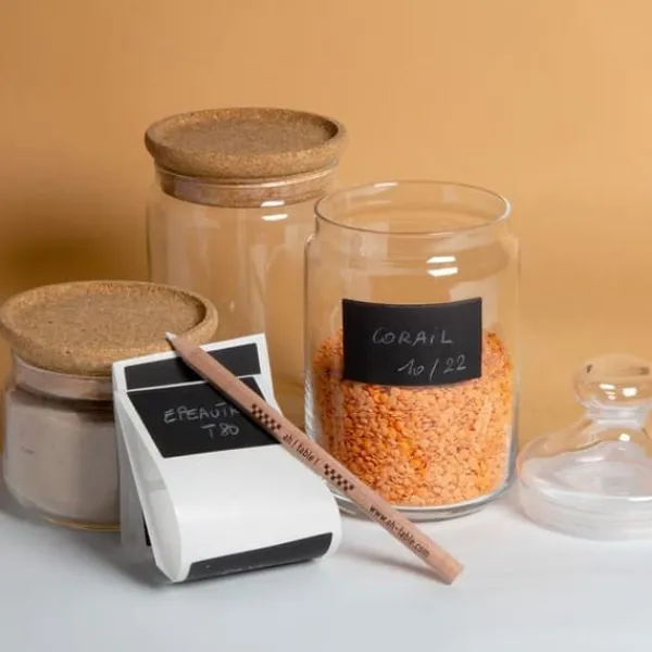 Dessa etiketter för glasburkar, med en speciell beläggning av ”skiffer”-typ, kan skrivas på med krita. Omplacerbara etiketter. Mått: 7 x 4 cm. Tillverkning Frankrike. Antal: 300 etiketter.