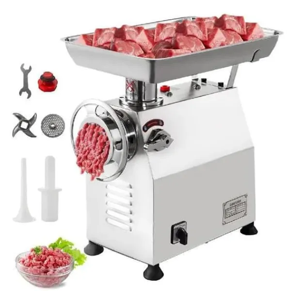 En fantastisk köttkvarn och korvmaskin. Hela kroppen är gjord av rostfritt stål. Den använder 1100W all koppar, snurrar vid 170 rpm och ger 770 lbs/h. Denna elektriska köttkvarn är idealisk för köttberedare (hjortkött, kyckling, fläsk, etc.). Den är perfekt för malning av mat på restauranger, stormarknader, snabbmatsrestauranger, slaktare och mer.