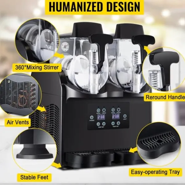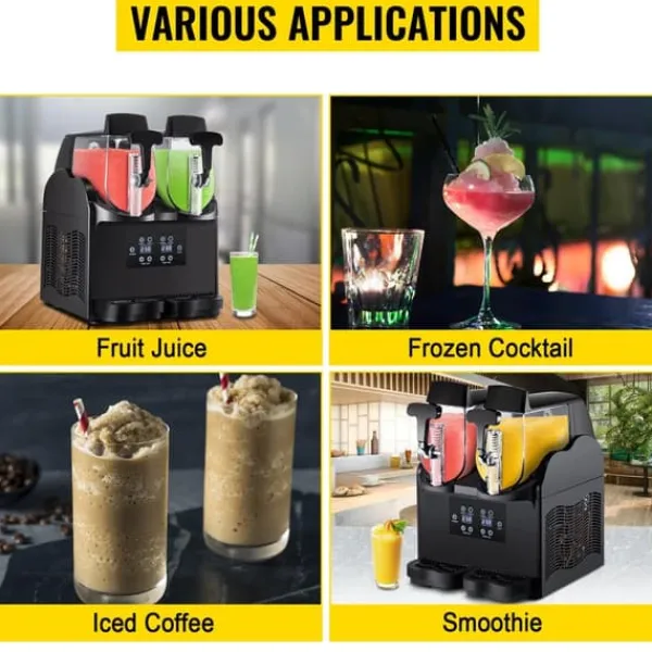 Med en total kapacitet på 5 liter/1,3 US gallon kan denna kommersiella slushmaskin med två burkar servera allt från puréer och smoothies till is eller fryst kaffe/te och frysta cocktails. Denna enhet kommer säkerligen att avsevärt utöka din dryckesmeny.