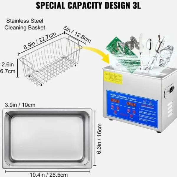 -SUS304-material av hög kvalitet: Tankstorlek: 3L Ultraljudseffekt: 120W Värmeeffekt: 100W; Denna ultraljudsrengörare är tillverkad av robust 304 rostfritt stål, vilket säkerställer att den är vattentät och har en lång livslängd. Dessutom kommer den med en extra korg för att minska kollisioner mellan vassa föremål och vattentanken.