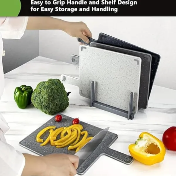 Det medföljande stället gör det enkelt att förvara skärbrädorna stående, antingen i ett hörn på bänken eller under skåpet – utan att ta upp onödig plats.