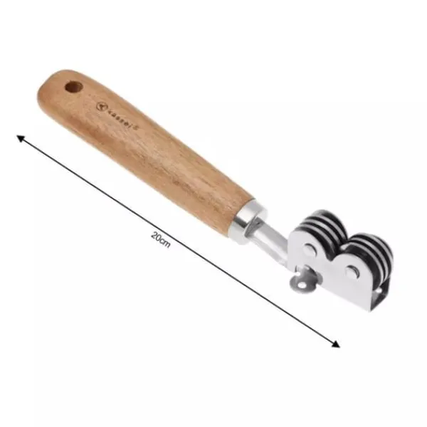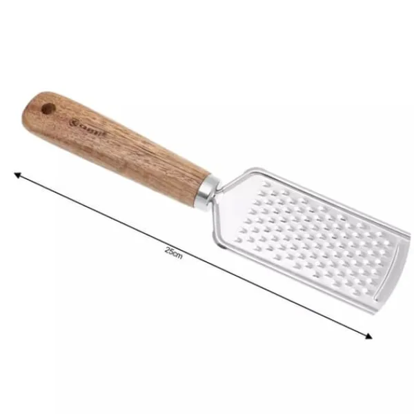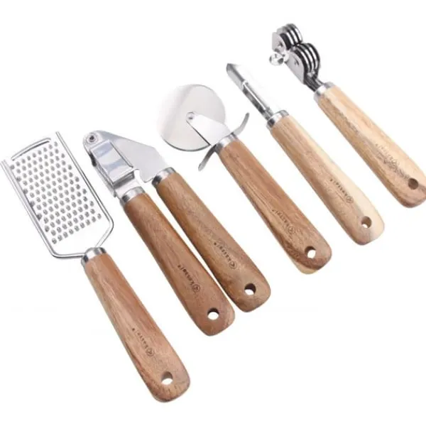 En uppsättning köksredskap av högkvalitativt rostfritt stål och massivt akaciaträ. Setet innehåller: – pizzaskärare – vitlökspress – frukt- och grönsaksskalare – vässare – rivjärn Det hela är förpackat i en estetisk, ekologisk låda.