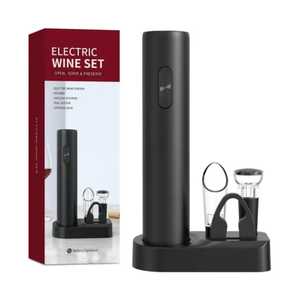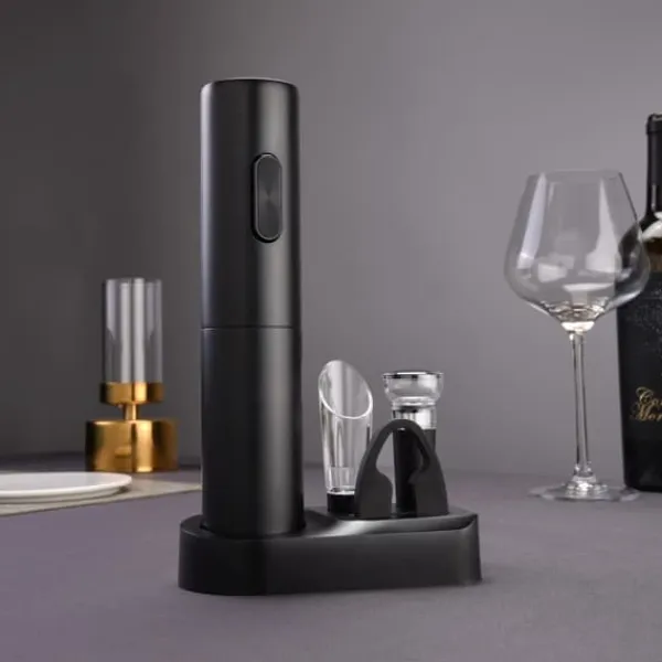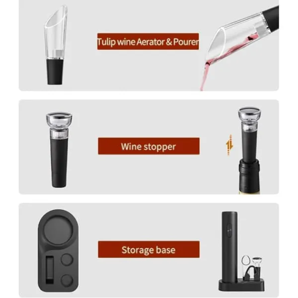 Omfattande 5-i-1-set: Detta vinöppnarset innehåller en elektrisk vinöppnare, folieskärare, vakuumflaskpropp, vinhällare och en bekväm förvaringsbas som täcker alla dina behov av att öppna, hälla och bevara vin.
