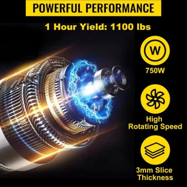 -Hög effektivitet: Denna kommersiella matskärare använder en 750W motor för att säkerställa en kraftfull maskin med en effekt på 500kg/1100lbs per timme. Maskinen är utrustad med 3 mm blad, skärtjockleken är lika stor.