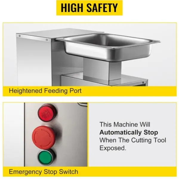 -Säker och pålitlig: Förhöjd matningsport, säker och bekväm. Utrustad med en nödstoppsbrytare för att förbättra säkerheten. Köttskäraren stannar automatiskt när kniven friläggs.