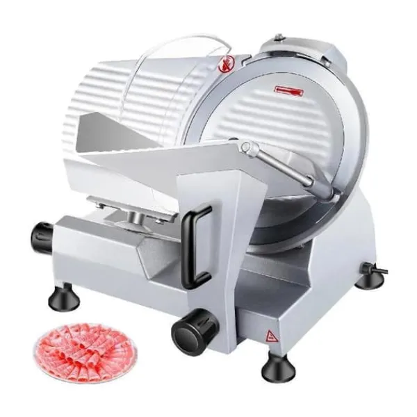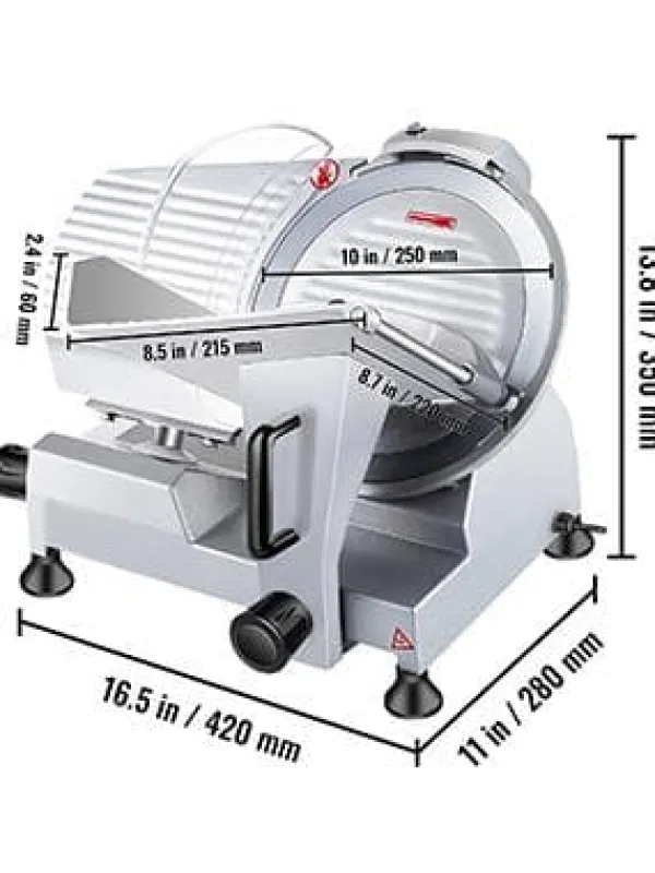 Denna köttskärare är gjord av gjuten aluminiumkropp och 10-tums förkromat stålblad med målad yta för korrosionsskydd och rostskydd. 240W kraftfull motor ger effektiv produktion. Tjockleksjusteringsområde: 0-0,47 tum/0-12 mm. Perfekt för hem och kommersiellt bruk.